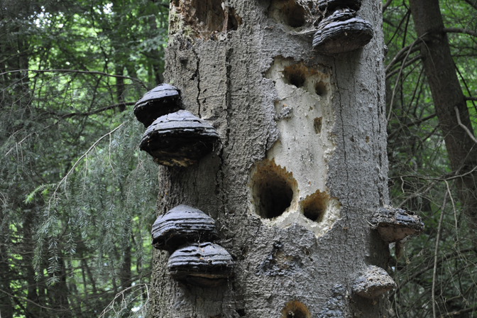 Mit zarterem Geklopfe suchen Schwarzspechte das Holz nach Käferlarven ab. Wieder andere Geräusche entstehen beim Anlegen der Nisthöhle, die tief ins Holz getrieben werden. Dabei ist der Zimmermann des Waldes, wie der Schwarzspecht auch genannt wird, auf weicheres Totholz im Wald angewiesen.